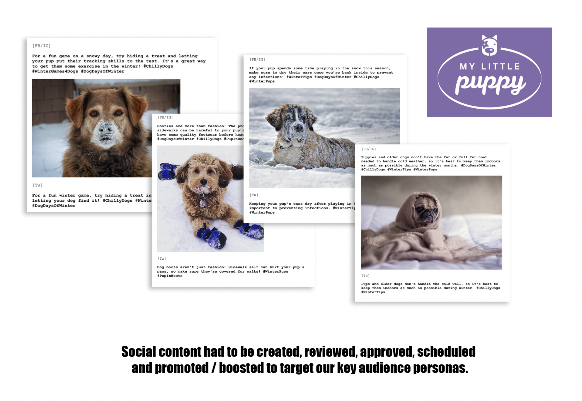 My Little Puppy had a unique network of local breeders for Pixel to promote on social. Through a combination of social content, paid social ads and other media, consumers were targeted based on breed preferences and landed in custom breed specific sites, where available puppies appeared alongside useful blog content about dogs in general and that breed in particular.